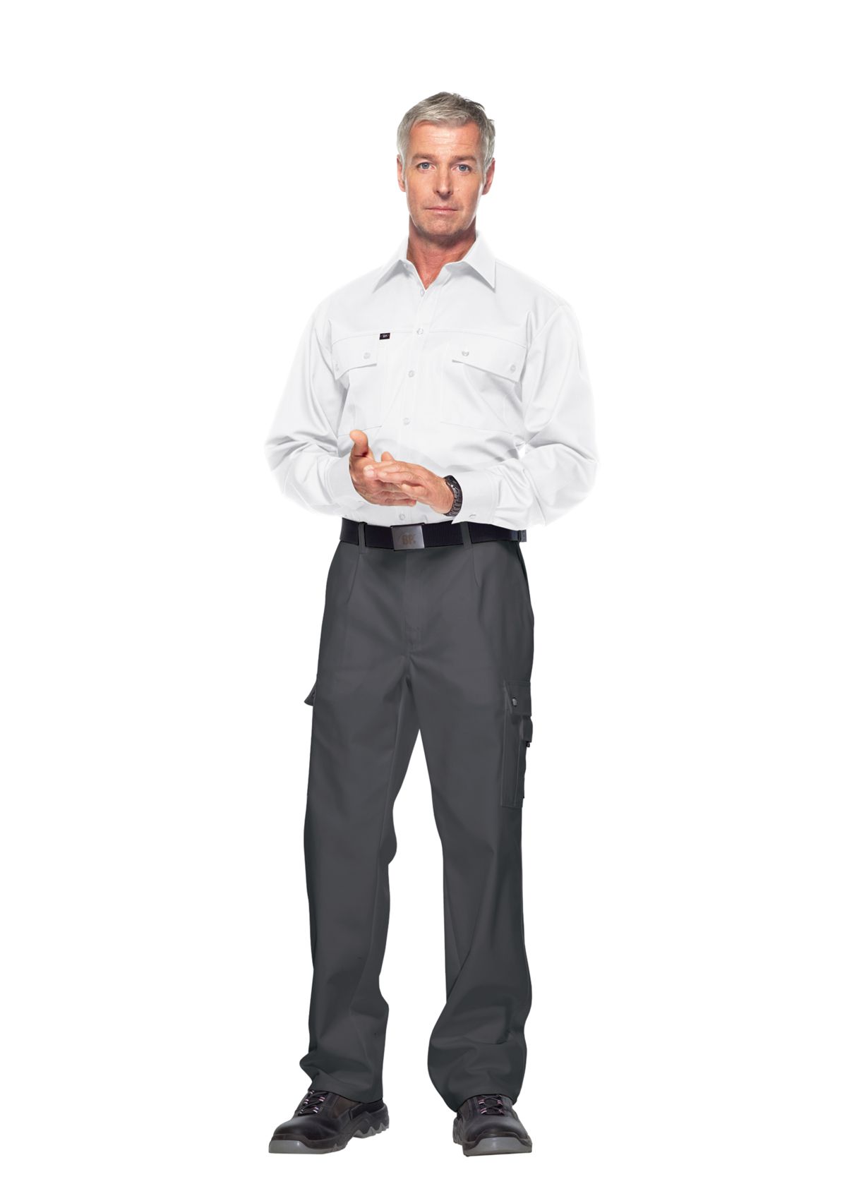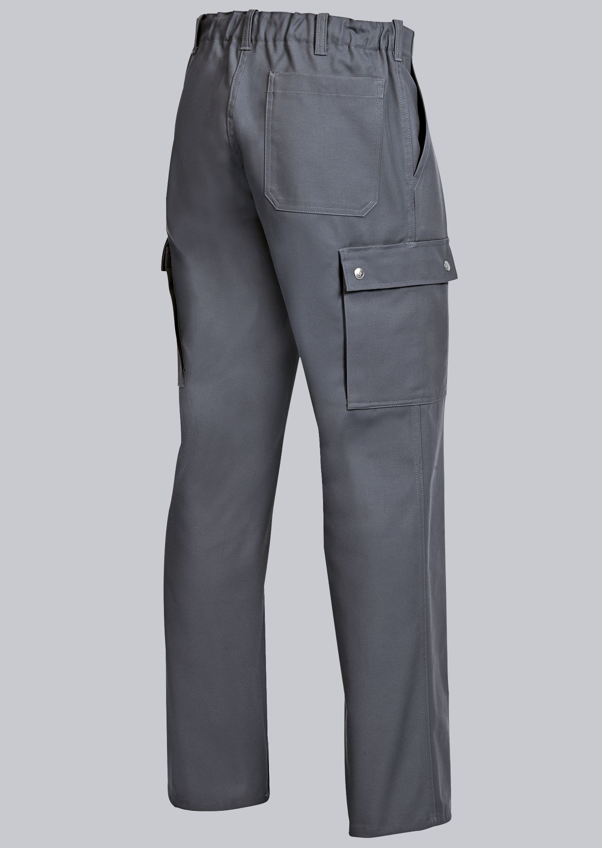 Gummizug im Rücken, Bundfalten, 2 Seitentaschen, 1 verschließbare Gesäßtasche mit Verstärkung, 2 Schenkeltaschen, davon 1 mit aufgesetzter Handy-Tasche und 1 mit integrierter Zollstocktasche