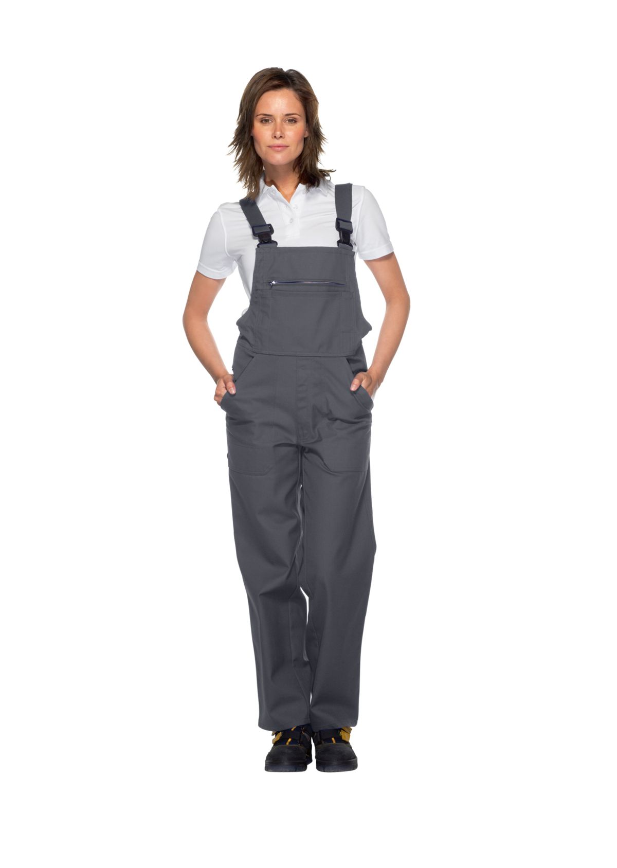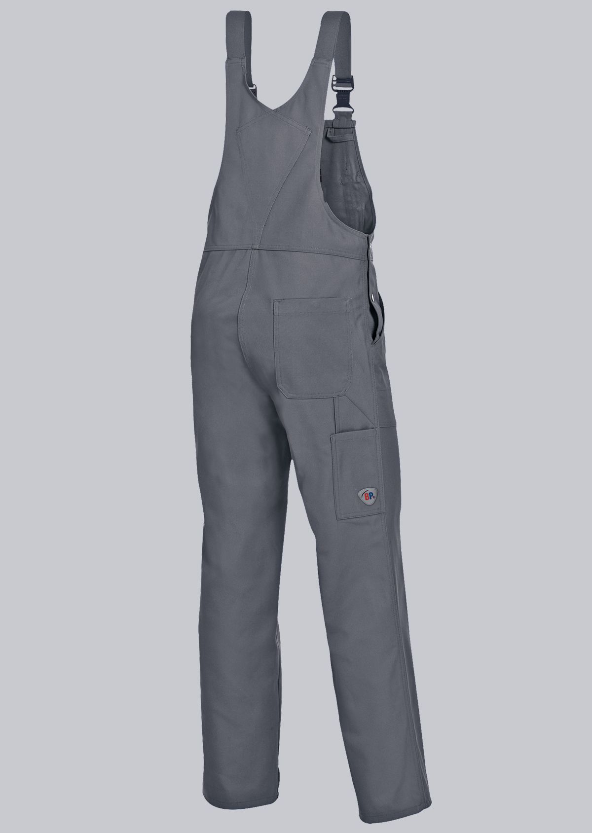 Stretchträger mit Kunststoff-Steckschnallen, doppelte Latztasche, davon 1 mit verdecktem Reißverschluss, 2 Stifttaschen, 2 aufgesetzte Seitentaschen, 1 verschließbare Gesäßtasche, doppelte Zollstocktasche, stabiler Schlitzreißverschluss, hochgezogener Rücken, Bundweite regulierbar durch verstellbaren Stretchkeil BP Flex