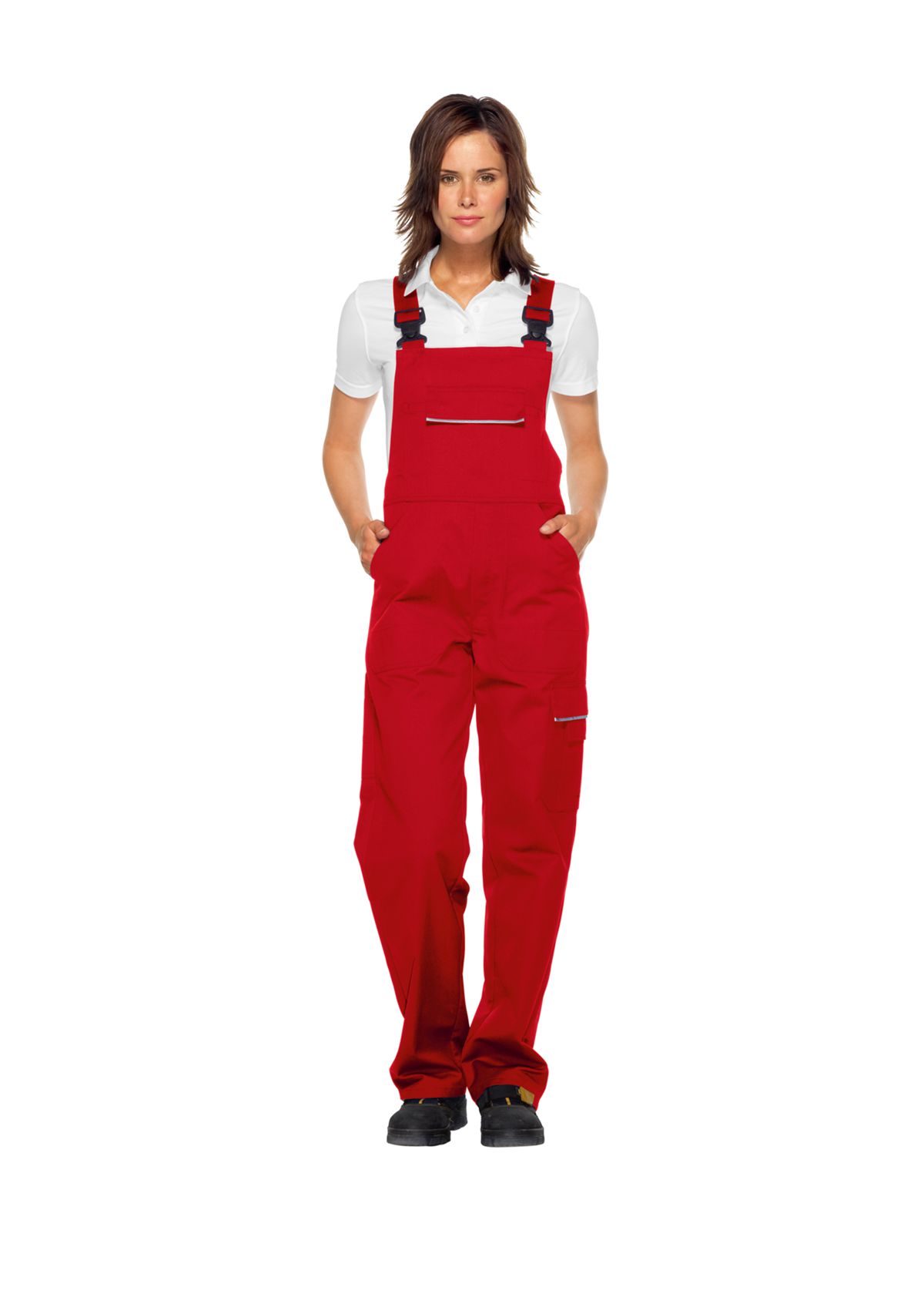 Stretchträger mit Kunststoff-Steckschnallen, Latztasche mit Patte verschließbar, 2 Stifttaschen, seitliche Stretch-Einsätze, 2 Seitentaschen, 1 mit Patte verschließbare Schenkeltasche mit aufgesetzter Handy-Tasche, hochgezogener Rücken, Zollstocktasche, 1 verschließbare Gesäßtasche, Schlitzreißverschluss, reflektierende Paspeln