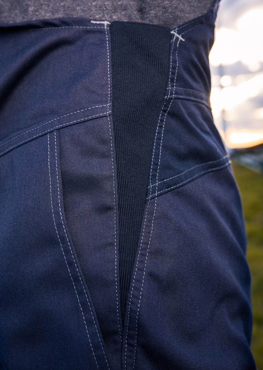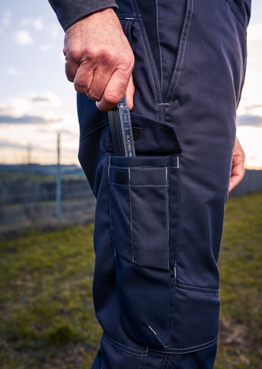 Stretchträger mit Kunststoff-Steckschnallen, doppelte Latztasche mit Reißverschluss und Taschenklappe, hochgezogener Rücken, ergonomischer Schnitt, 2 Seitentaschen, 1 mit Patte verschließbare Gesäßtasche, 1 geräumige Schenkeltasche mit aufgesetzter Smartphonetasche, freihängende Zollstocktasche mit Stifttaschen, Reflexelemente am Bein, vorgeformtes Bein, Kniepolstertaschen (Kniepolster 1839 bitte separat bestellen)
