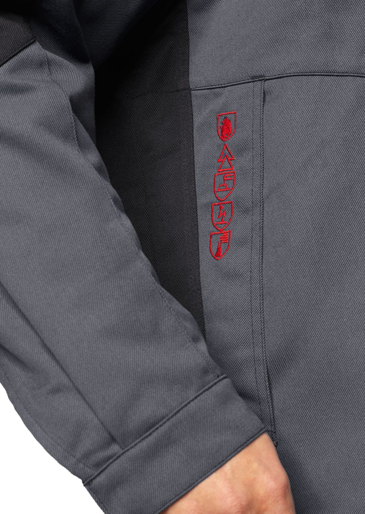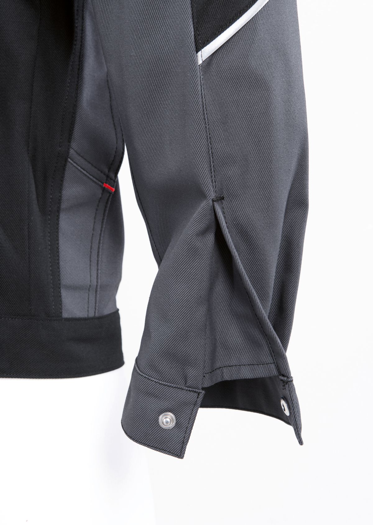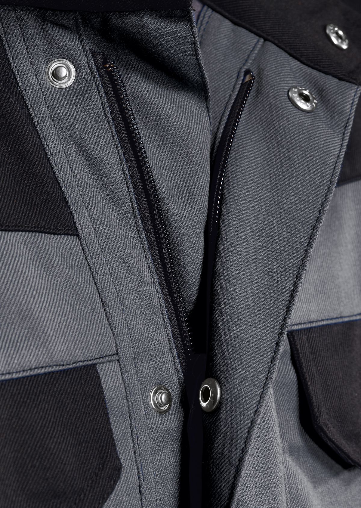 Stehkragen, verdeckter Reißverschluss und Druckknopfleiste, 2 mit Patte verschließbare Brusttaschen, 2 mit Blende verschließbare Seitentaschen, 1 innenliegende Handytasche mit Patte, verschließbare Ärmelbündchen, Front und Ärmel zweilagig