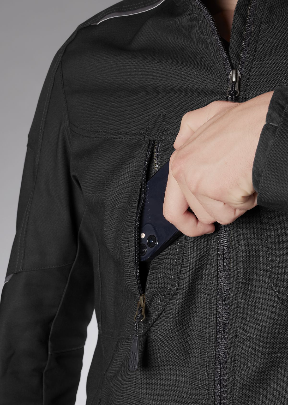 Gefütterter Stehkragen, Frontreißverschluss mit Fleece-Kinnschutz, 1 Brusttasche mit Reißverschluss, 2 geräumige Seitentaschen mit Reißverschluss, 1 Ärmeltasche mit Reißverschluss, Armliftsystem für mehr Bewegungsfreiheit, Ärmelabschluss mit Windschutz, Reflexelemente