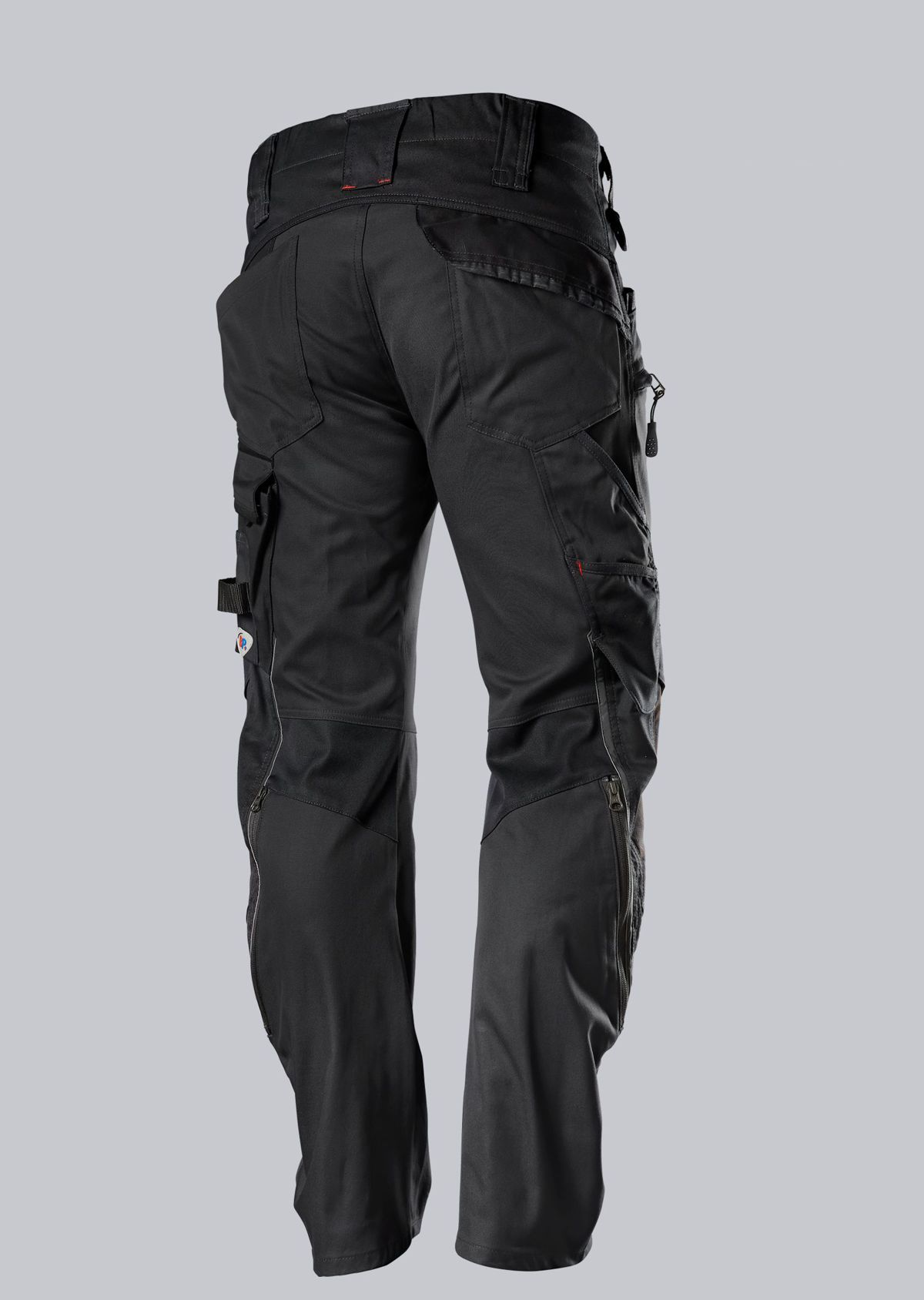 Erhöhter Dehnbund im Rücken für optimalen Sitz, D-Ring zum Befestigen von Accessoires, 2 Seitentaschen, 2 Gesäßtaschen, davon 1 Tasche mit Patte verschließbar, 1 geräumige, mit Patte verschließbare Schenkeltasche, 1 Stifttasche, 1 innenliegende Schenkeltasche mit Reißverschluss, doppelte Zollstocktasche, ergonomischer Schnitt, Netzeinsatz mit Reißverschluss zur Belüftung, Reflexelemente am Bein, Kniepolstertaschen (BP® Kniepolster 1839-000-53 bitte separat bestellen)