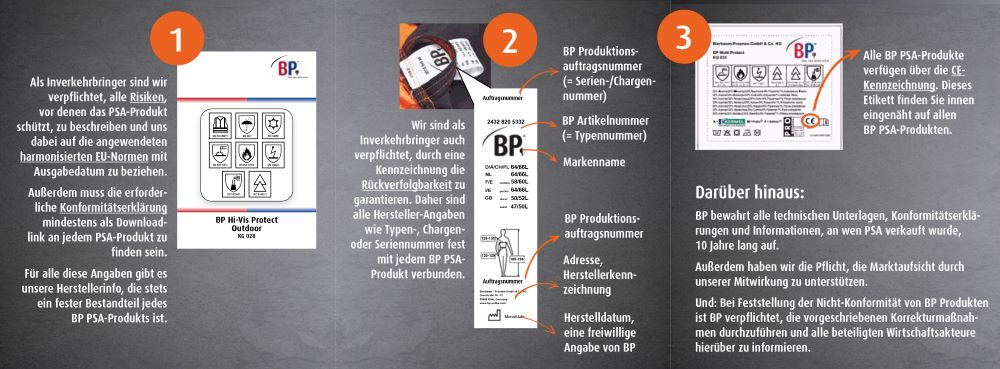 Als Inverkehrbringer sind wir verpflichtet, alle Risiken, vor denen das PSA-Produkt schützt, zu beschreiben und uns dabei auf die angewendeten harmonisierten EU-Normen mit Ausgabedatum zu beziehen. Außerdem muss die erforderliche Konformitätserklärung mindestens als Downloadlink an jedem PSA-Produkt zu finden sein. Für alle diese Angaben gibt es unsere Herstellerinfo, die stets ein fester Bestandteil jedes BP® PSA-Produkts ist.