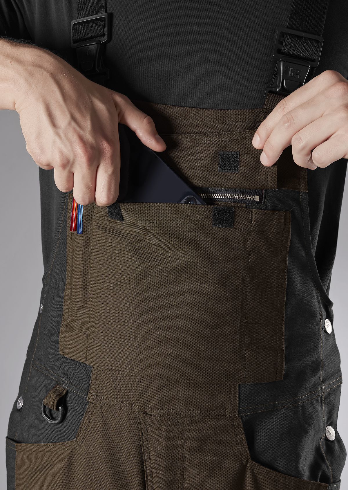 Stretchträger mit Kunststoff-Steckschnallen, doppelte Latztasche mit Patte verschließbar, davon 1 Tasche mit verdecktem Reißverschluss, Bundweite durch verstellbaren Stretchkeil BP® Flex regulierbar, hochgezogener Rücken mit Stretcheinsatz für mehr Bewegungsfreiheit, Schlitzreißverschluss, 2 Seitentaschen, 2 Gesäßtaschen, davon 1 Tasche mit Patte verschließbar, 1 geräumige Schenkeltasche mit integrierter Reißverschlusstasche und aufgesetzter Smartphonetasche, 2 Stifttaschen, doppelte Zollstocktasche, ergonomischer Schnitt, Reflexelemente am Bein, Kniepolstertaschen aus Cordura® (BP® Kniepolster 1839-000-53 bitte separat bestellen)