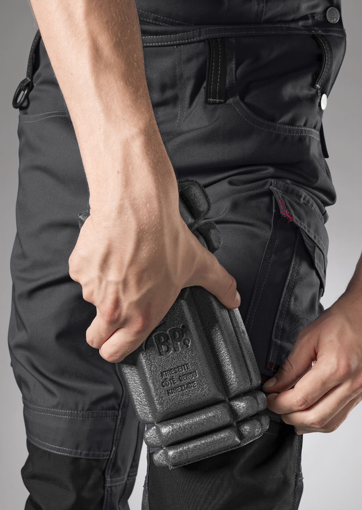 Stretch braces with plastic clip fastenings, double bib pocket with zip and flap, 2 pen pockets, higher back with stretch insert for greater freedom of movement, adjustable waist, belt loops, ergonomic cut, D-ring, 2 side pockets, 2 back pockets with flap and press-stud fastening, 1 large thigh pocket with smartphone patch pocket, double ruler pocket sewn down on one side, pre-shaped leg with movement insert on knee, Cordura® pockets for inserting knee pads 1839 (please order separately)