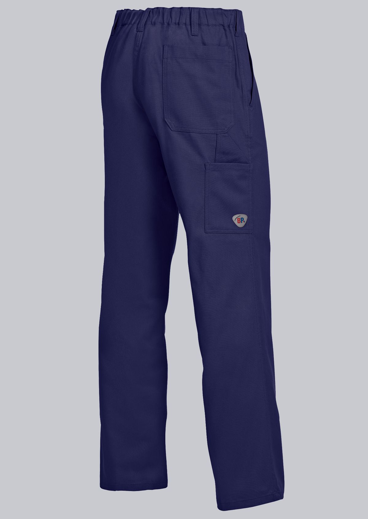 Elasticated back, pleats, zip fly, 2 side pockets, double ruler pocket, 1 fastening back pocket