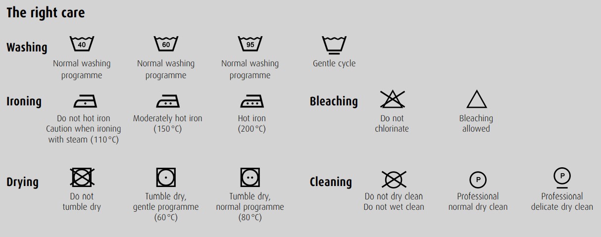 The symbols make it easier to identify textiles that are suitable for certain washing and drying processes, thus ensuring clear communication along the entire textile supply chain - from production to retail to the laundry. They include information such as maximum washing temperatures, recommended drying processes and dry-cleaning options that ensure the quality and functionality of clothing is maintained even after intensive use.