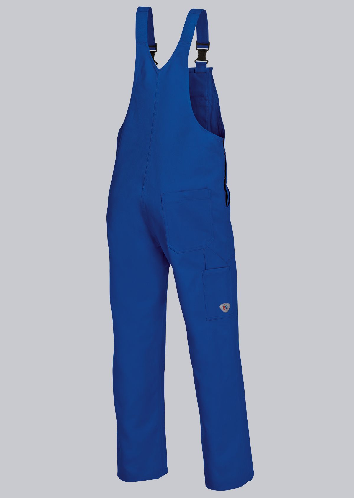 Bretelles tissu avec empiècement élastique, boucles clic-clac en plastique, double poche bavette, dont 1 avec fermeture à glissière dissimulée, 1 poche crayon, 2 poches latérales, 1 poche revolver avec fermeture, double poche mètre, braguette avec fermeture à glissière, dos montant, taille réglable