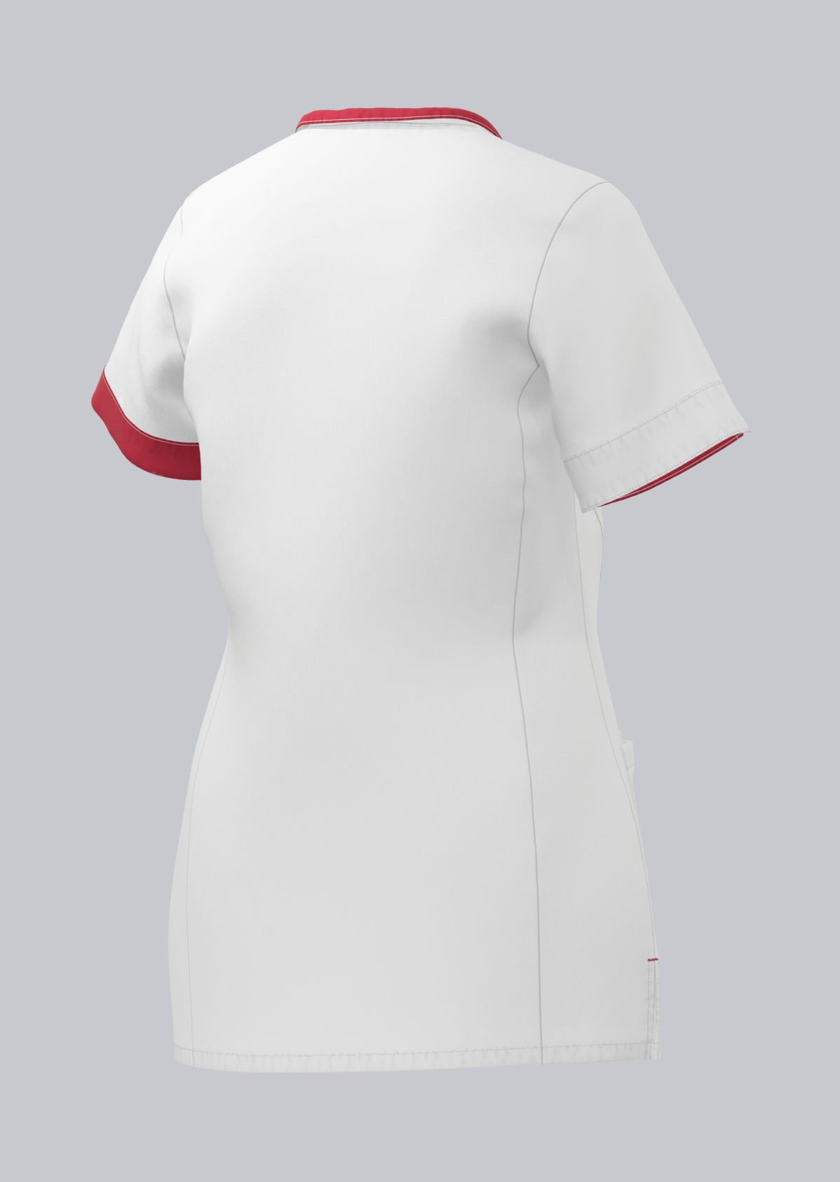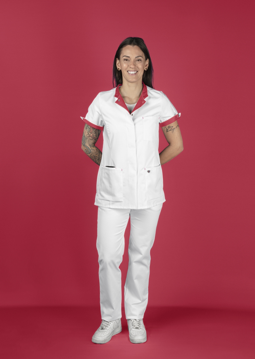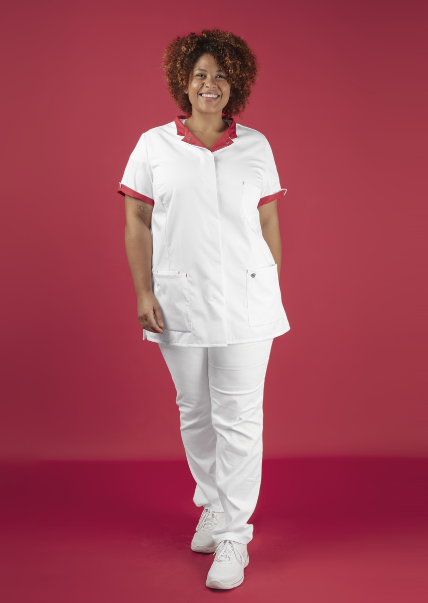 Manches 1/2 retroussables à parement de couleur, col rabattable à parement de couleur, patte à boutons-pression dissimuée, 2 poches latérales dont une avec poche pour bip, fentes de côté, broderies de couleur sur les poches et sur les fentes des côtés et des manches, coutures de séparation pour une coupe seyante