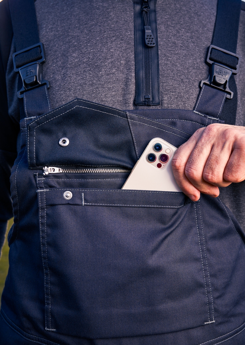 Elastische schouderbanden met kunststof klikgespen, grote dubbele borstzak met ritssluiting en klep, hoog ruggedeelte, ergonomische snit, 2 zijzakken, 1 met klep afsluitbare achterzak, 1 ruime beenzak met opgezette smartphonezak, loshangende duimstokzak met pennenzakken, reflecterende elementen op broekspijpen, ergonomisch gevormde broekspijpen, voorkant broek twee lagen, kniezakken voor kniekussens 1839 (moeten apart besteld worden)